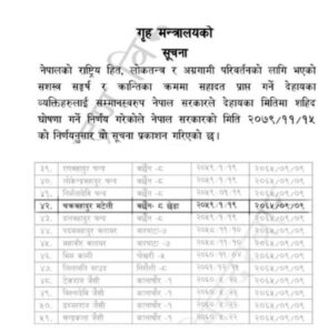नेपाल सरकारले गत फागुन १५ गते गरेको निर्णय अनुसार गृह मन्त्रालयले राज पत्रमा सार्वजनिक गरेको सहिदहरुको नाममा जिवित रहेका मटेलिको ४२ नम्बर नाम राखेको छ।