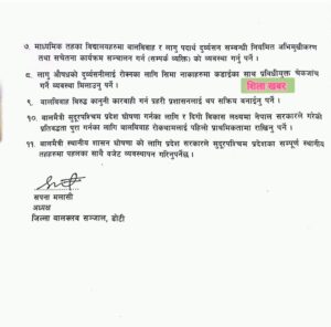 त्यस्तै जिल्ला बाल क्लब सञ्जाल डोटीले बालबालिका सम्बन्धी  ११ बुँदे माग राख्दै ज्ञापन पत्र बुझाएको छ।  जिल्ला स्तरीय बालबालिकाहरूको नेतृत्व विकास फोरममा सुदूर पश्चिम प्रदेश सभा सदस्य ओलीलाई बाल क्लब अध्यक्ष सपना मलासीले बुझाएकी हुन् ।