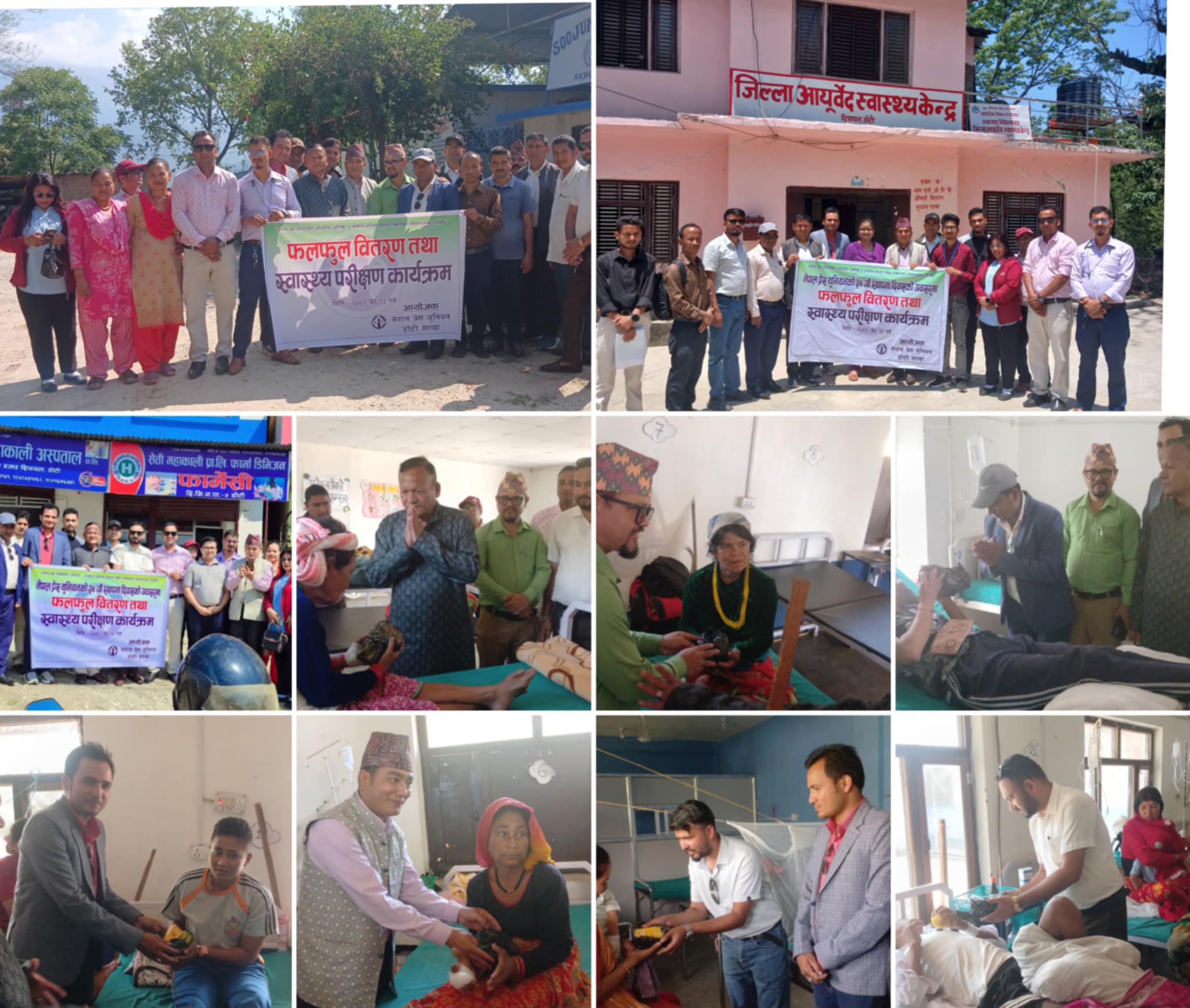 दिवसका अवसरमा सुजङ अस्पताल राजपुर र सेती महाकाली अस्पताल दिपायलमा रहेका बिरामीहरूलाई फलफूल वितरण तथा आयुर्वेद स्वास्थ्य केन्द्र दिपायलमा पत्रकाहरुको स्वास्थ्य परीक्षण गरिएको नेपाल प्रेस युनियन डोटीका अध्यक्ष चक्र बहादुर कुँवरले बताए ।
