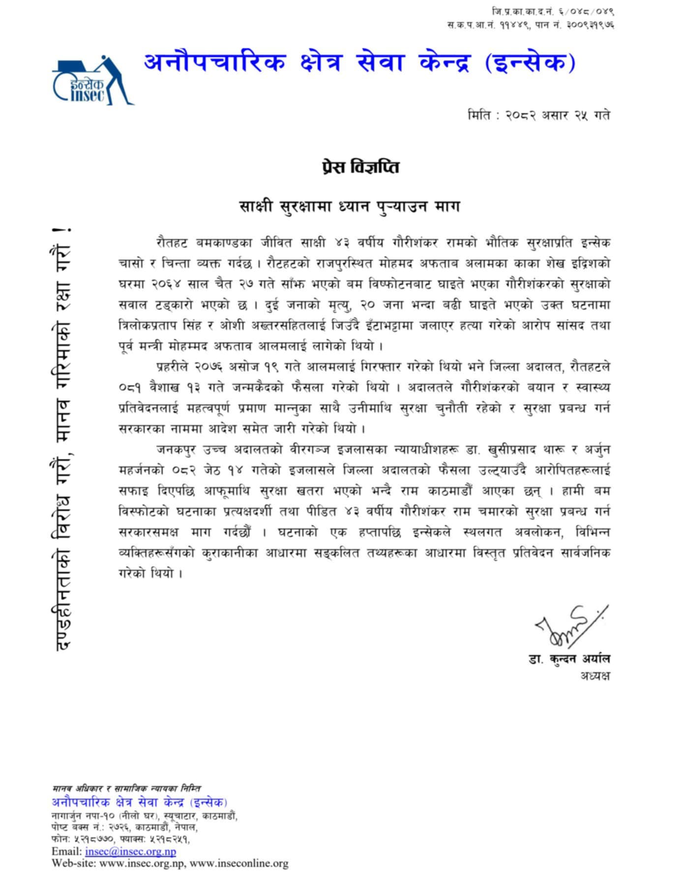 रौटहटको राजपुरस्थित मोहमद अफताब अलामका काका शेख इद्रिशको घरमा २०६४ साल चैत २७ गते साँझ भएको बम विष्फोटनबाट घाइते भएका गौरीशंकरको सुरक्षाको सवाल टड्कारो भएको इन्सेकका अध्यक्ष डा. कुन्दन अर्यालद्वारा हस्ताक्षरित विज्ञप्तिमा जनाइएको छ । सो घटनामा दुई जनाको मृत्यु, २० जना भन्दा बढी घाइते भएको र घाइतेमध्ये त्रिलोकप्रताप सिंह र ओशी अख्तरसहितलाई जिउँदै इँटाभट्टामा जलाएर हत्या गरेको आरोप सांसद तथा पूर्व मन्त्री मोहम्मद अफताव आलमलाई लागेको थियो । प्रहरीले २०७६ असोज १९ गते आलमलाई गिरफ्तार गरेको र जिल्ला अदालत, रौतहटले ०८१ वैशाख १३ गते जन्मकैदको फैसला गरेको स्मरण गर्दै अदालतले गौरीशंकरको बयान र स्वास्थ्य प्रतिवेदनलाई महत्वपूर्ण प्रमाण मान्नुका साथै उनीमाथि सुरक्षा चुनौती रहेको र सुरक्षा प्रबन्ध गर्न सरकारका नाममा आदेश समेत जारी गरेको थियो ।