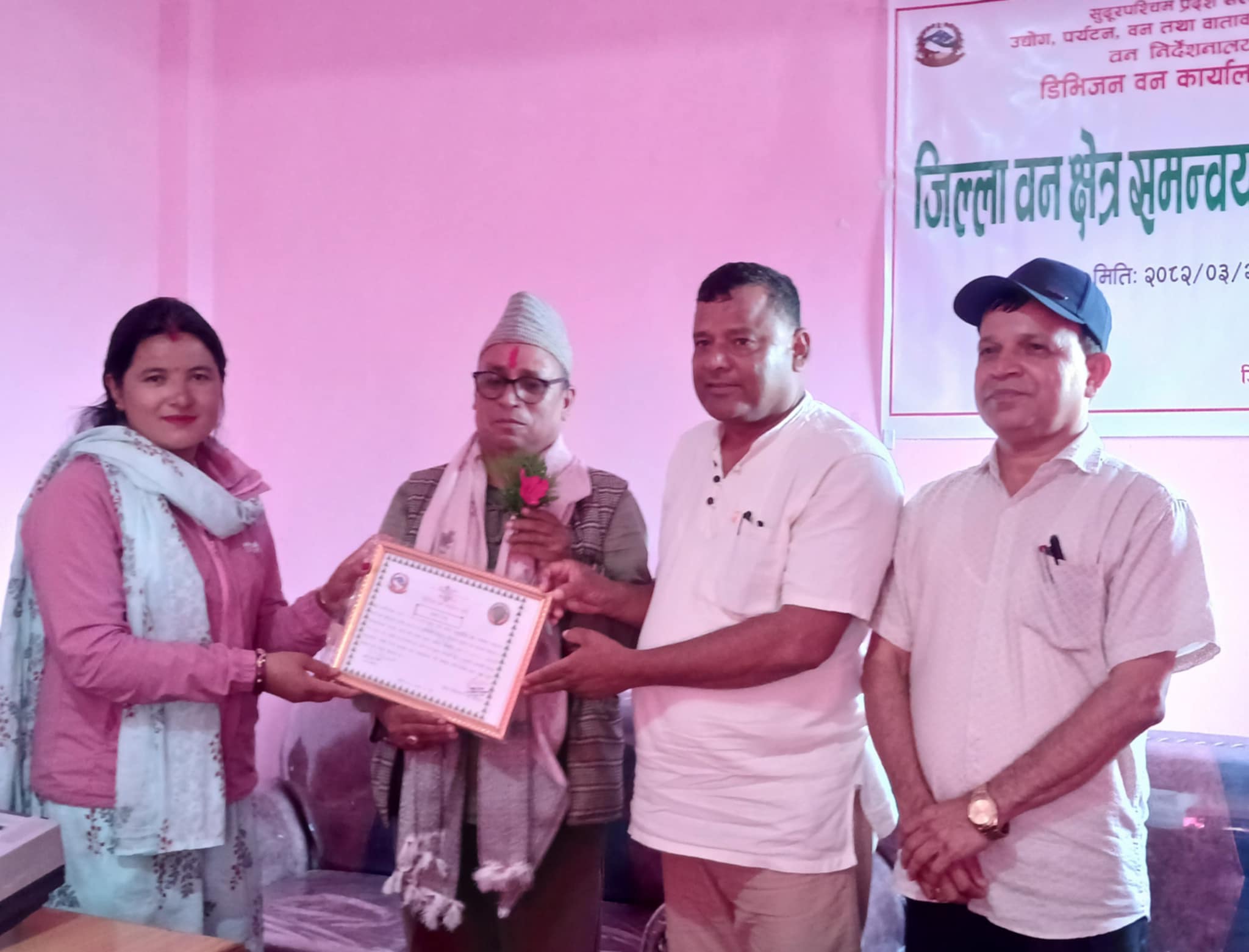 उत्कृष्ट हुन सफल सामुदायिक वनलाई जिल्ला वन समन्वय समितिको बैठकमा पुरस्कार प्रदान गरिएको छ ।