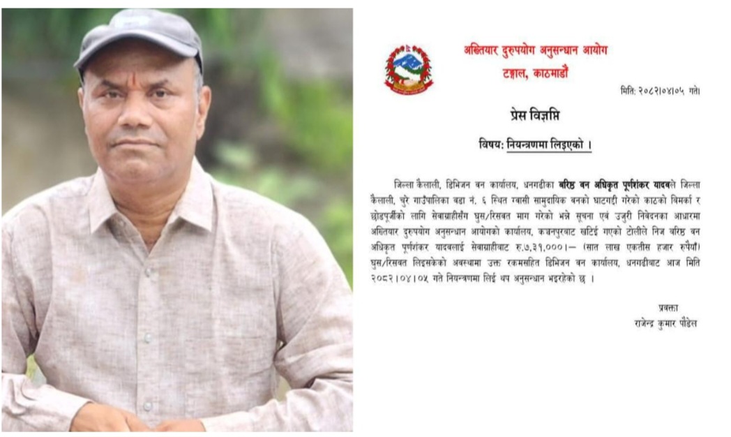 साउन ५ गते ,धनगढी : कैलालीको डिभिजन वन कार्यालय, धनगढीमा कार्यरत वरिष्ठ बन अधिकृत पूर्णशंकर यादवलाई सात लाख ३१ हजार रुपैया घुससहित रंगेहात पक्राउ गरिएको छ ।