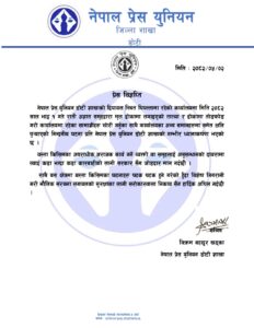 प्रेस युनियन डोटीका अध्यक्ष चक्र कुँवरको अध्यक्षतामा बसेको आकस्मिक बैठकले प्रेस युनियनको भवनको कार्यालयमा तोडफोड गर्ने कार्यको युनियनले घोर निन्दा र भर्त्सना गरेको छ । तोडफोड र चोरीमा संलग्नको पहिचान गरी तत्काल पक्राउ गरेर कानुनबमोजिम कारबाहीको दायरामा ल्याउन माग गरिएको छ।