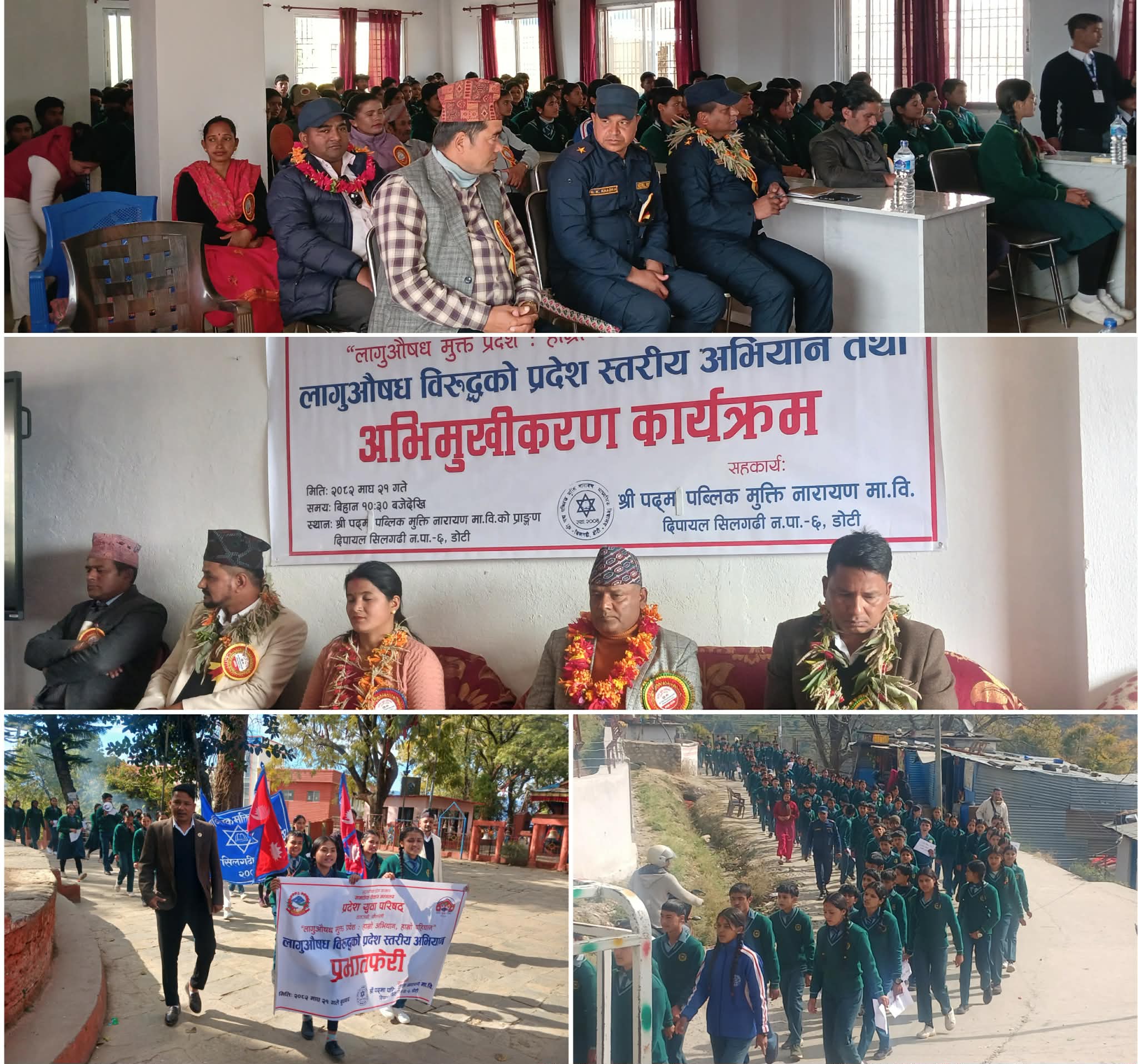 बुधबार दिपायल सिलगढी नगरपालिका–६ स्थित पद्म पब्लिक मुक्तिनारायण माध्यमिक विद्यालयको सभाहलमा “लागु औषध मुक्त प्रदेश : हाम्रो अभियान, हाम्रो पहिचान” भन्ने नाराका साथ कार्यक्रम आयोजना गरिएको हो।